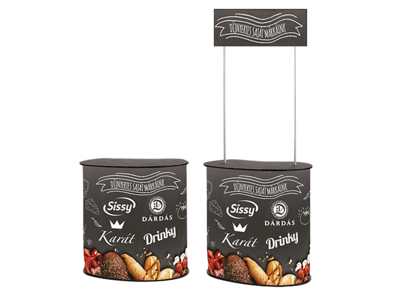 A pultra helyezhető dekoráció egy matt laminálással ellátott, fotóminőségű pop-up film nyomat. Ezt az anyagot számos pultunknál használjuk hosszú évek óta, mivel kellően merev az íves felületek dekorálásához. A matt laminálással ellenállóvá és hosszú életűvé tesszük a nyomatot, így sokáig számíthat rá. A nyomatot tépőzárral lehet rögzíteni a palástlemezre, így egy palástlemezhez több dekorációt is rendelhet, amit saját kezűleg cserélhet a rendezvény helyszínén.