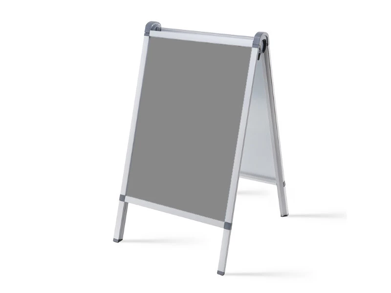 A megállító tábla oldalán nincsenek lenyíló távtartók, a táblát a felső részen található stop-mechanikás nyitókarral lehet kinyitni, majd kitámasztani „A” formába. A tábla mind a két oldalán felnyitható alumínium keretprofilok találhatóak. A keretprofilok egy síkba esnek a lábazattal, így letisztult a megjelenése. Az eloxált alumínium keretprofil 31 mm széles, és a plakátból körben minden oldalon ~ 1 cm-t takar el.