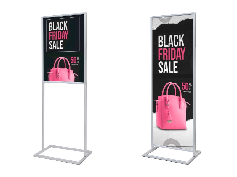 Kétoldalas plakáttartó állvány, mely szürke és fekete színben is elérhető.