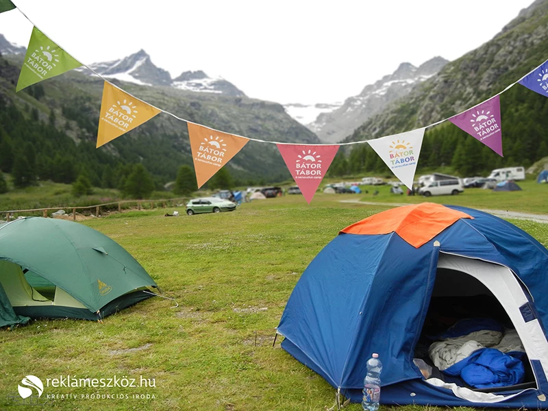 Egyedi grafikával készített, díszítő vagy reklám funkciót betöltő zászlófüzér. A zászlócskák 20 × 30 cm méretűek és két méterenként 5 db van felvarrva belőlük.