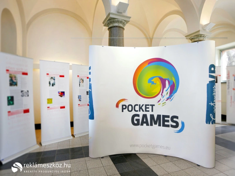 Költséghatékony íves pop-up fal szerkezet, felül akasztós kivitelben, minőségi, laminált pop-up film nyomattal.