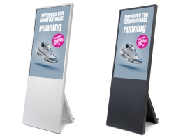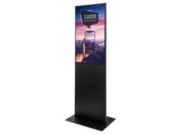 Használatra kész, modern Samsung képernyővel felszerelt digitális kijelző állvány, mely álló vagy fekvő formátumú kijelzővel is használható.