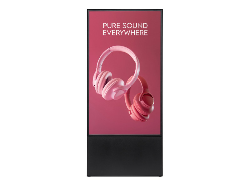 Egészen más karaktert képvisel a Light digitális megállító tábla. Míg a totemoszlop a magasba emelkedő látványra épít, addig a megállító tábla a járókelők szemmagasságát célozza meg – pontosan úgy, ahogy egy klasszikus megállító tábla tenné, csak éppen 21. századi, digitális tartalommal. A Light sorozat egyik jellegzetessége az ultra vékony, mindössze 25 milliméteres profil. Ez az elegancia azonban nem megy a stabilitás rovására: az acélváz és a 10 milliméteres gumiláb szilárd, megbízható alapot biztosít. A tábla összecsukható kitámasztólábbal rendelkezik, amely nyitott pozícióban rögzíthető – így akár forgalmasabb területen sem kell attól tartani, hogy egy erősebb szellő vagy egy elhaladó járókelő felborítja. A szállítás itt is átgondolt: az állvány egyszerűen összehajtható, és a 21,95 kilogrammos összsúllyal a tábla könnyen mozgatható. A csomagolási méret (1425 × 650 × 105 mm) szintén személyautóval kezelhető, bár némileg nagyobb helyet igényel, mint a totemoszlop. A kijelző technológia tekintetében a megállító tábla ugyanazt a Samsung QM43C panelt kapja, mint a totemoszlop: 4K felbontással, 500 nit fényerővel, 1200:1 kontrasztaránnyal és 24/7 üzemidővel számolhatunk.. A tartalomkezelés szintén azonos: USB plug & play, Wi-Fi, távvezérlő, és opcionális Samsung VXT CMS.